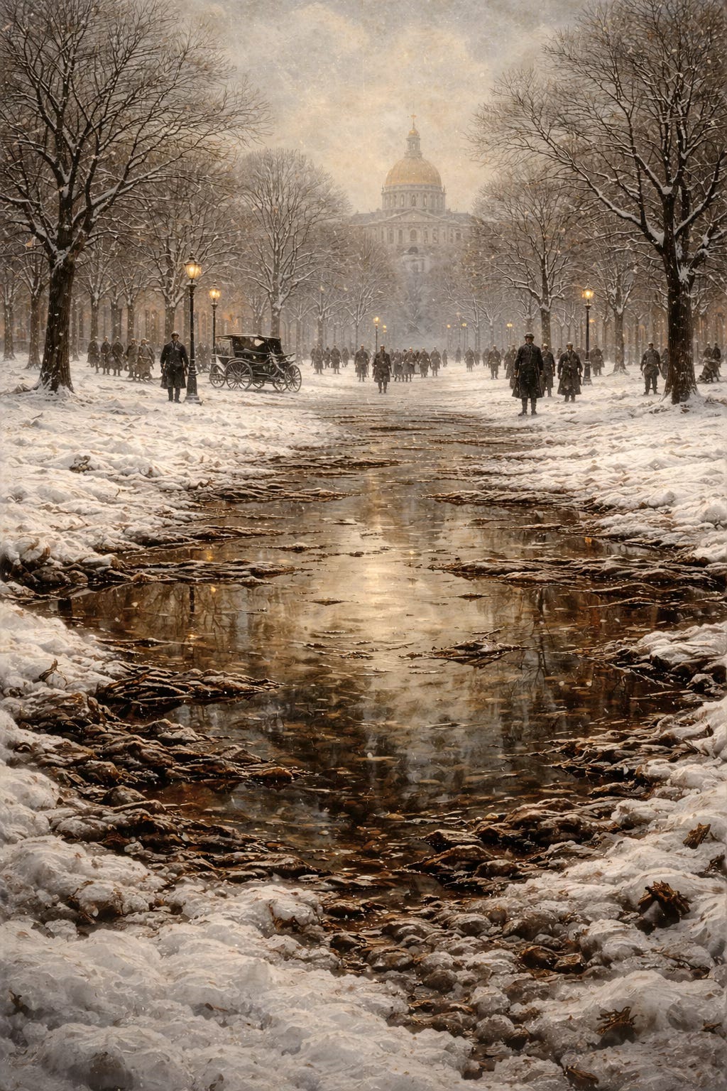 Crossing a bare common, in snow puddles, at twilight, under a clouded